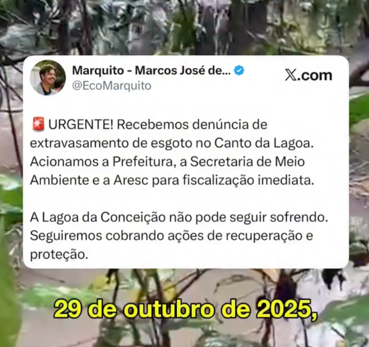 “Recebemos denúncia de extravasamento de esgoto no Canto da Lagoa. A Lagoa da Conceição não pode seguir sofrendo. Seguiremos cobrando ações de recuperação e proteção”, escreveu o parlamentar.